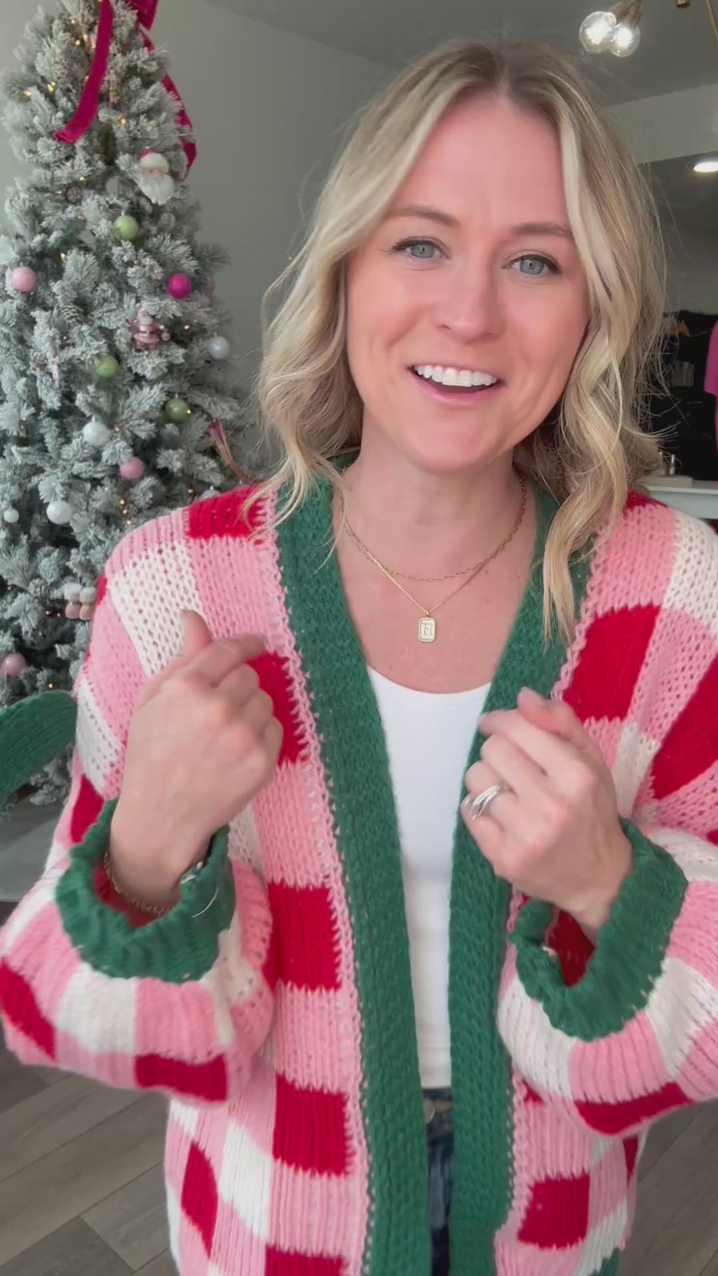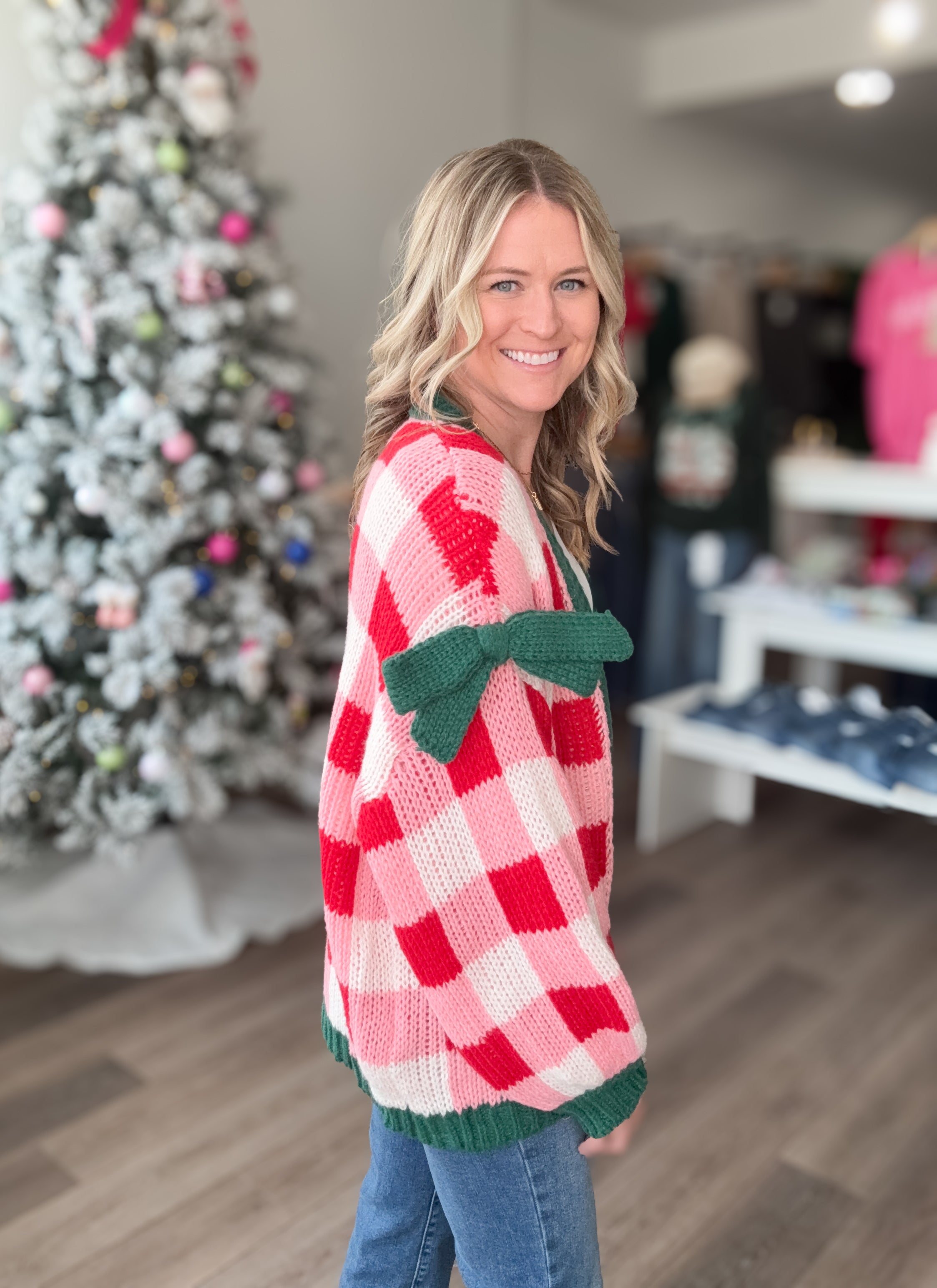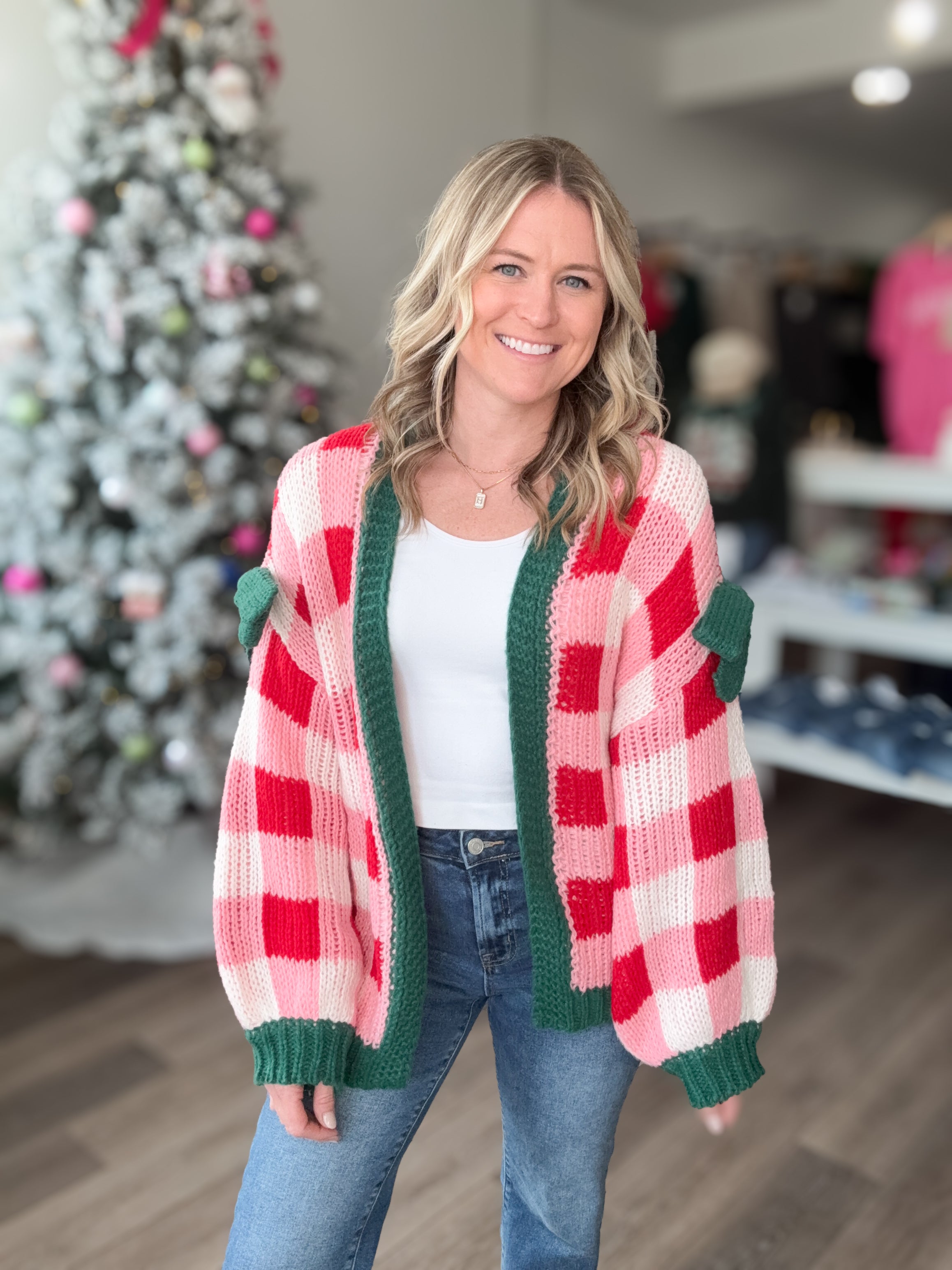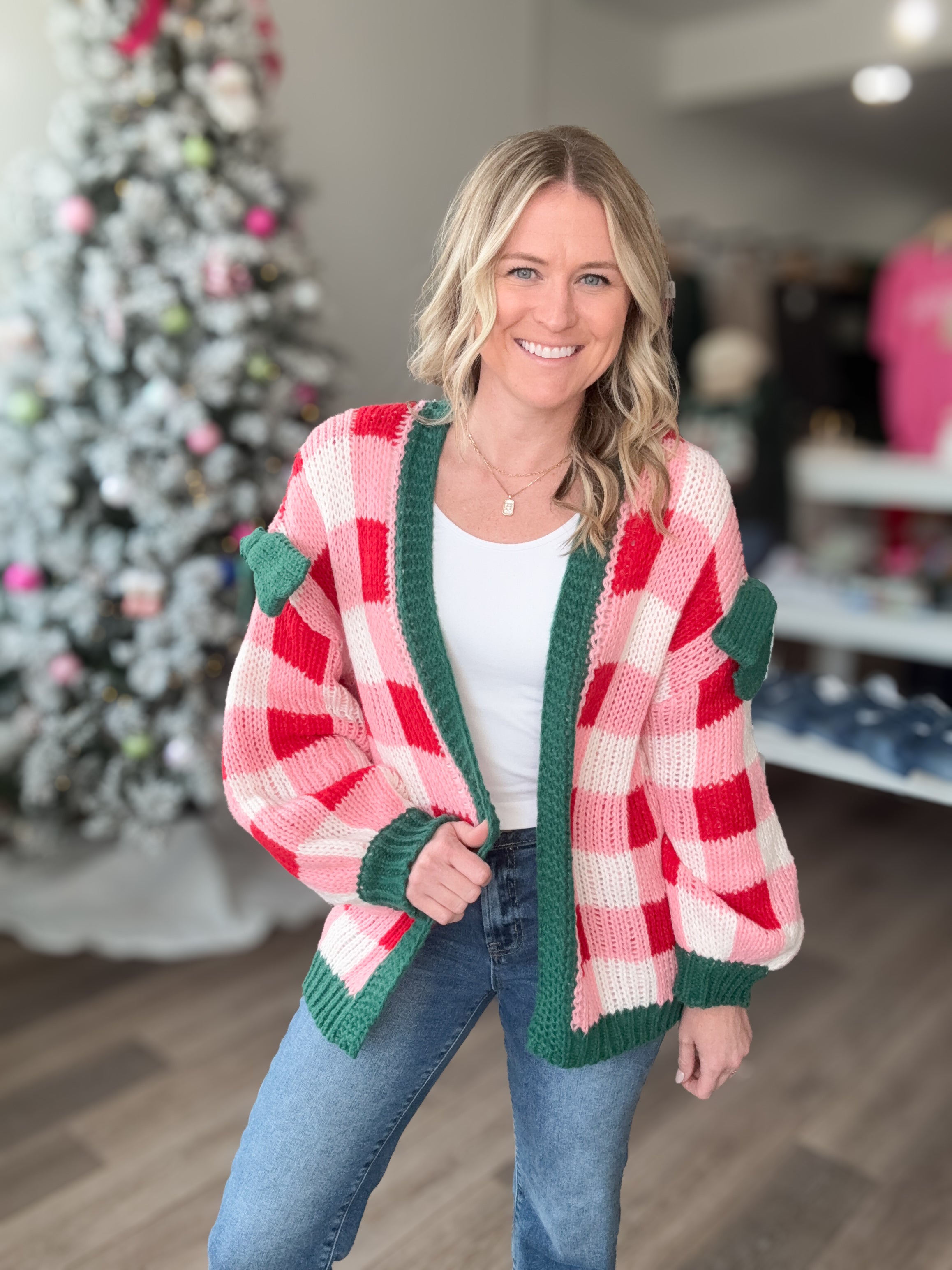 Get ready for all the festive fun with this adorable Cute for Christmas Open Front Cardigan! This loose-knit, oversized cardigan brings the holiday cheer with its playful mix of pink, red, and white checkered print, all trimmed in a rich festive green. The standout detail? The sweetest green bows on each arm—adding the perfect touch of whimsy to your holiday look. Easy to layer over your favorite holiday graphic tee or a simple solid top!