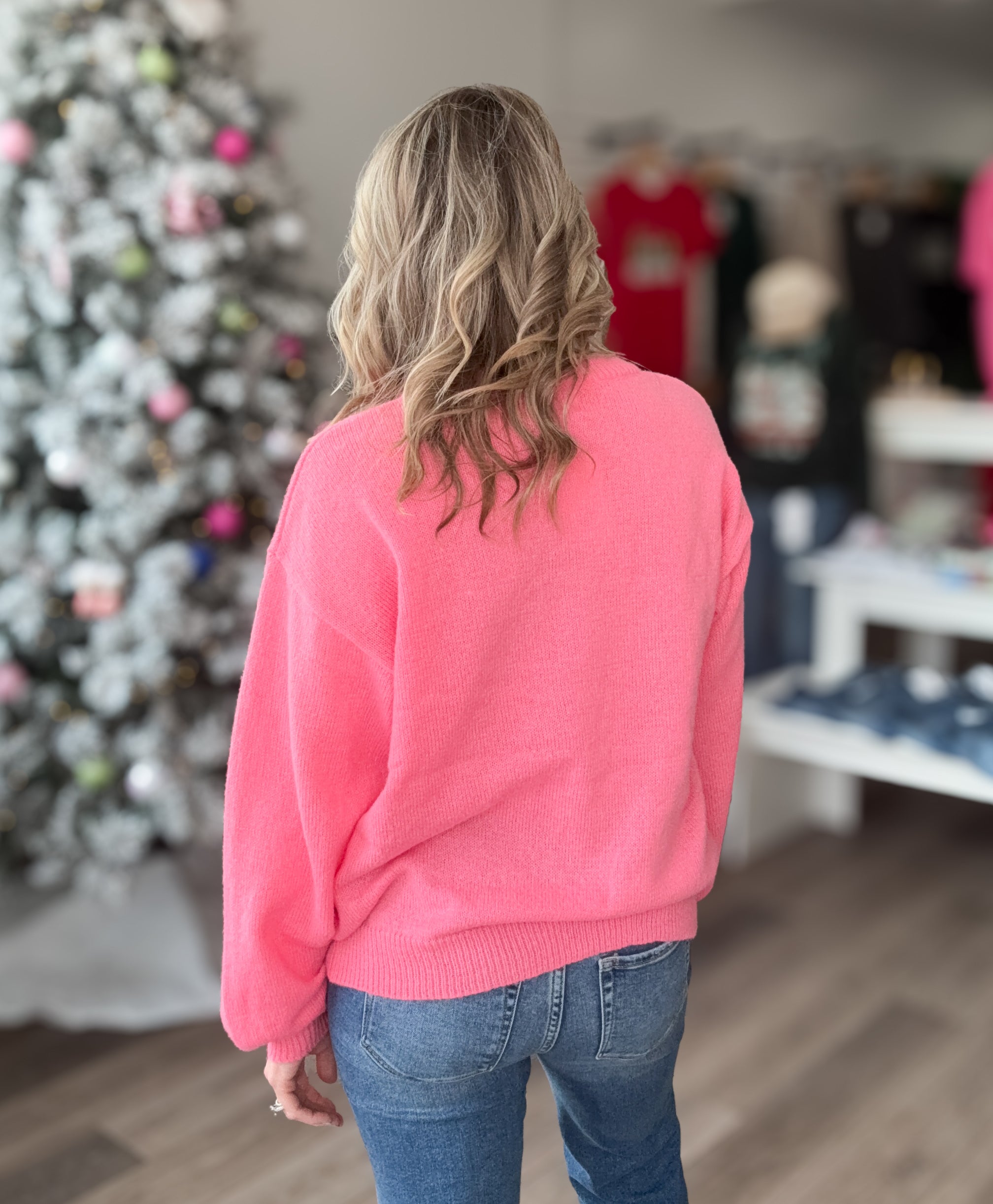 Bring all the festive cheer in this adorable Sequin Santa Pink Sweater! This hot pink knit sweater is sprinkled with the cutest sequin Santa faces, giving you just the right amount of holiday sparkle. The balloon sleeves add a fun, cozy touch, while the soft knit keeps it comfortable for all-day winter wear. Perfect for parties, photos, or simply spreading Christmas joy!