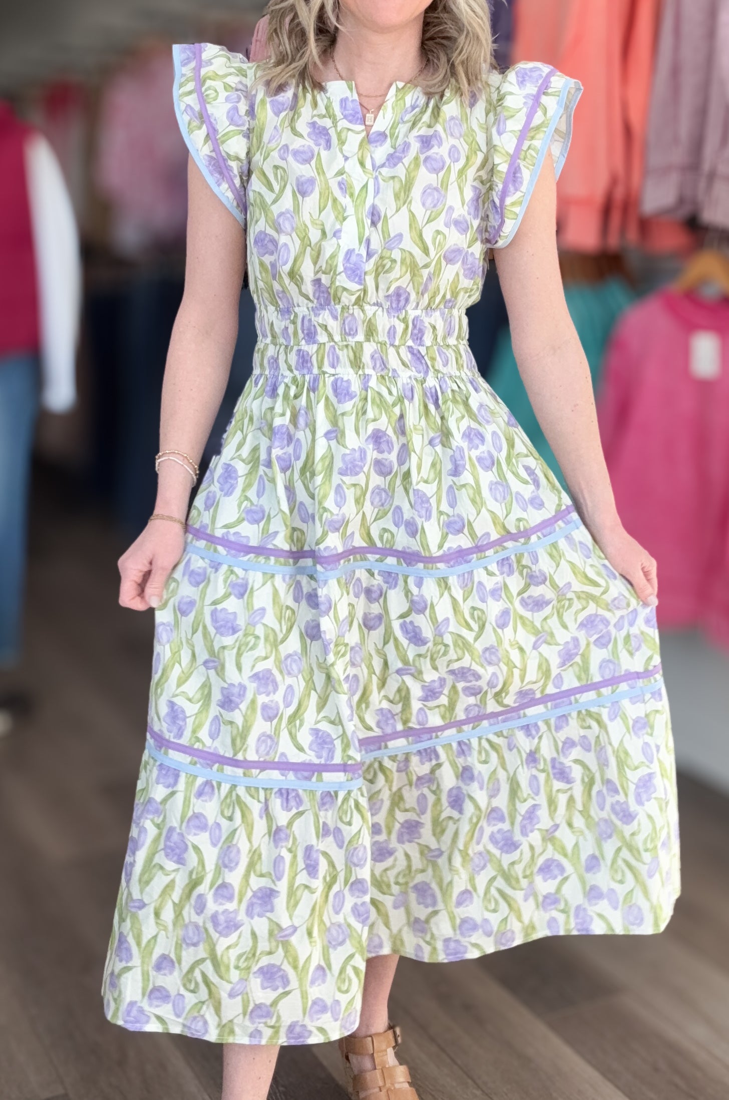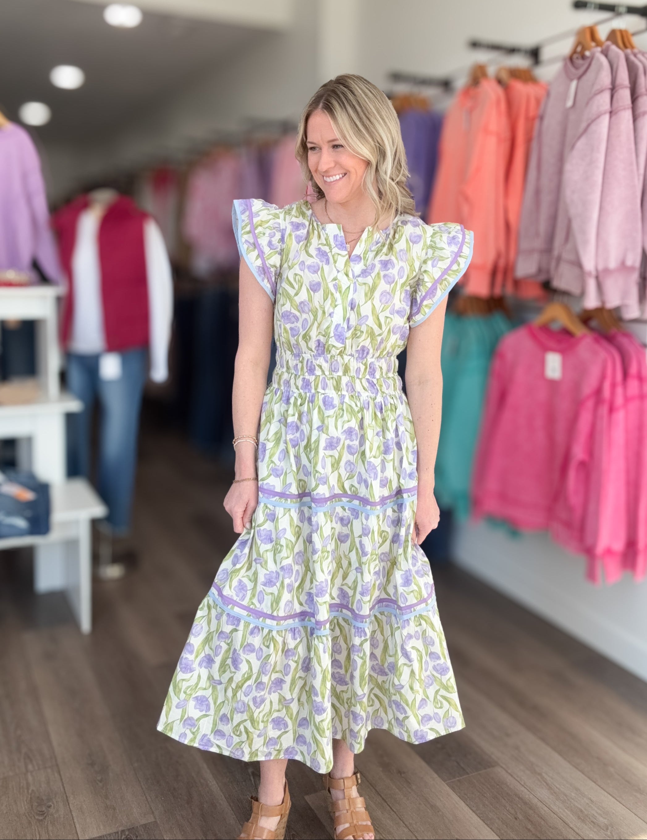 Soft, feminine, and effortlessly elegant—this floral midi dress is the perfect piece for spring events, showers, or everyday pretty. The lilac and green floral pattern paired with delicate trim details gives this dress such a cute feminine feel.