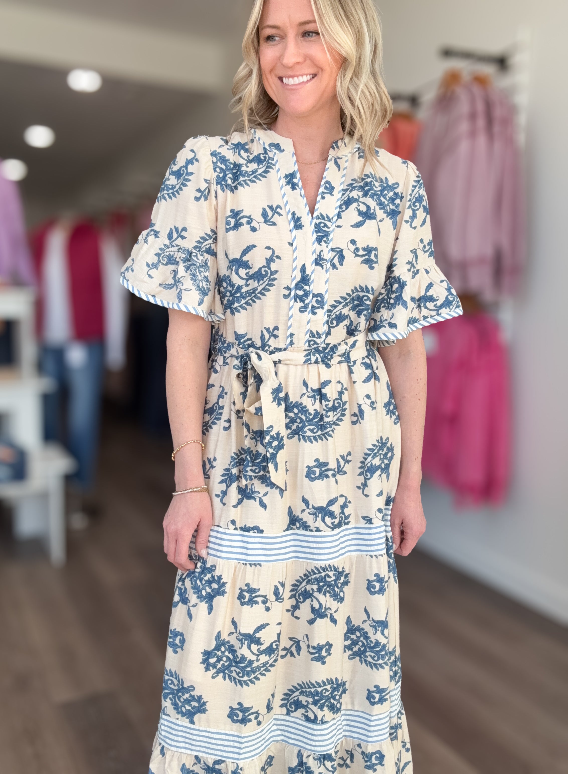Feminine, flirty, and effortlessly beautiful—this maxi dress is made for twirling through spring and summer days. The soft cream background paired with charming patterned details and striped accents gives this dress such a standout beautiful look.