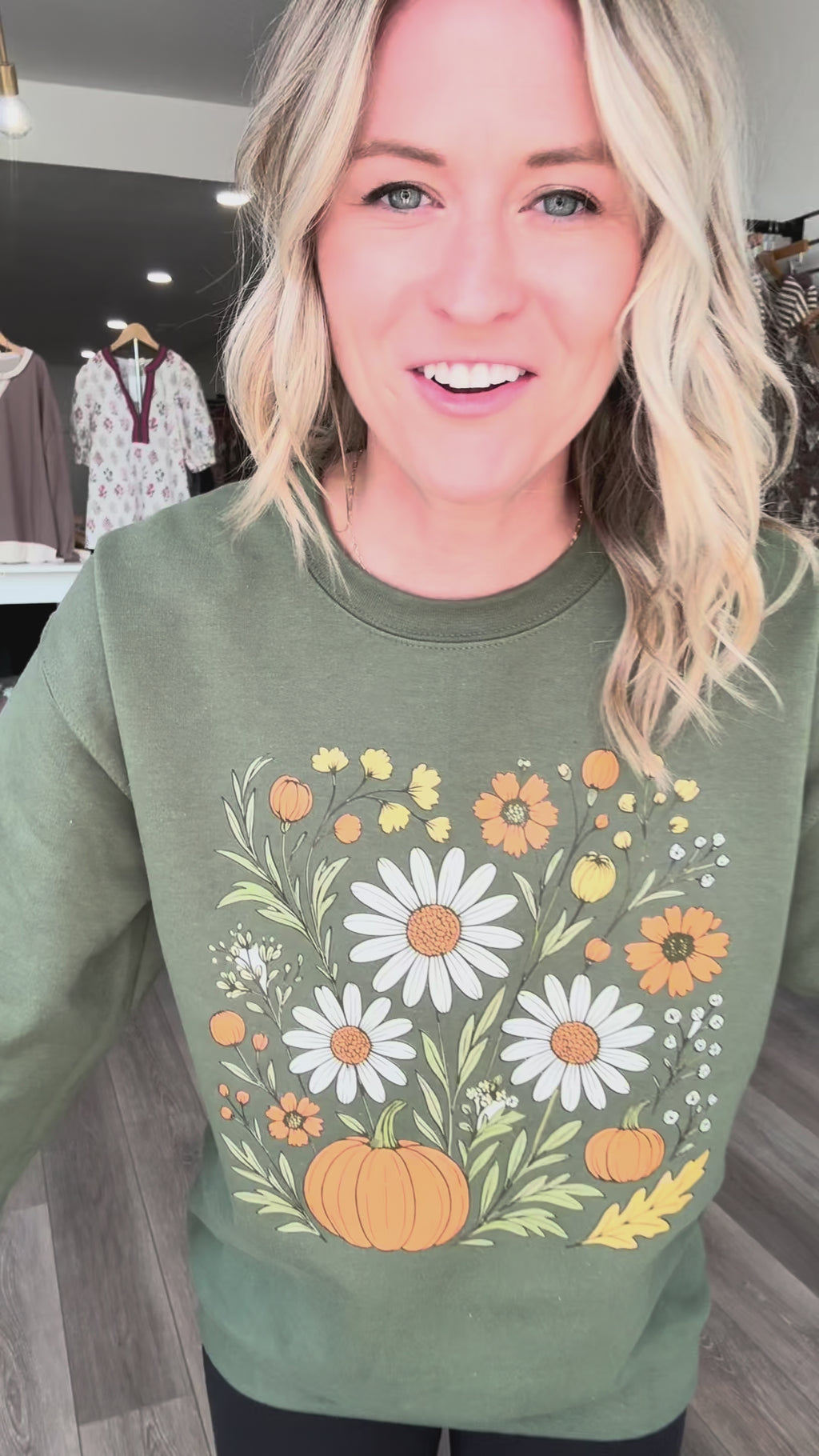 Bring the beauty of autumn into your wardrobe with our Fall Floral Pumpkin Sweatshirt. Featuring a charming fall graphic with blooming daisies, golden florals, and pumpkins, this cozy pullover is perfect for crisp days and casual outings.