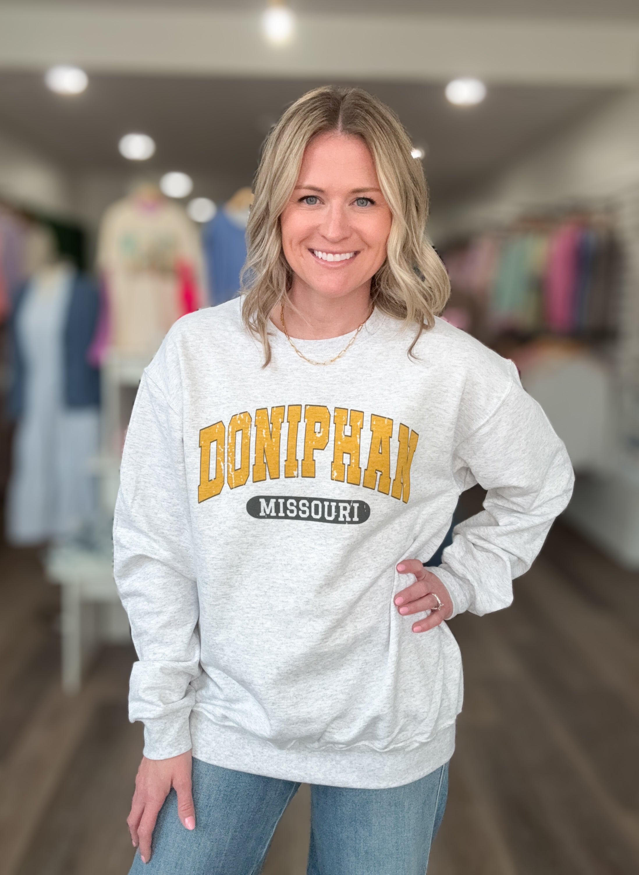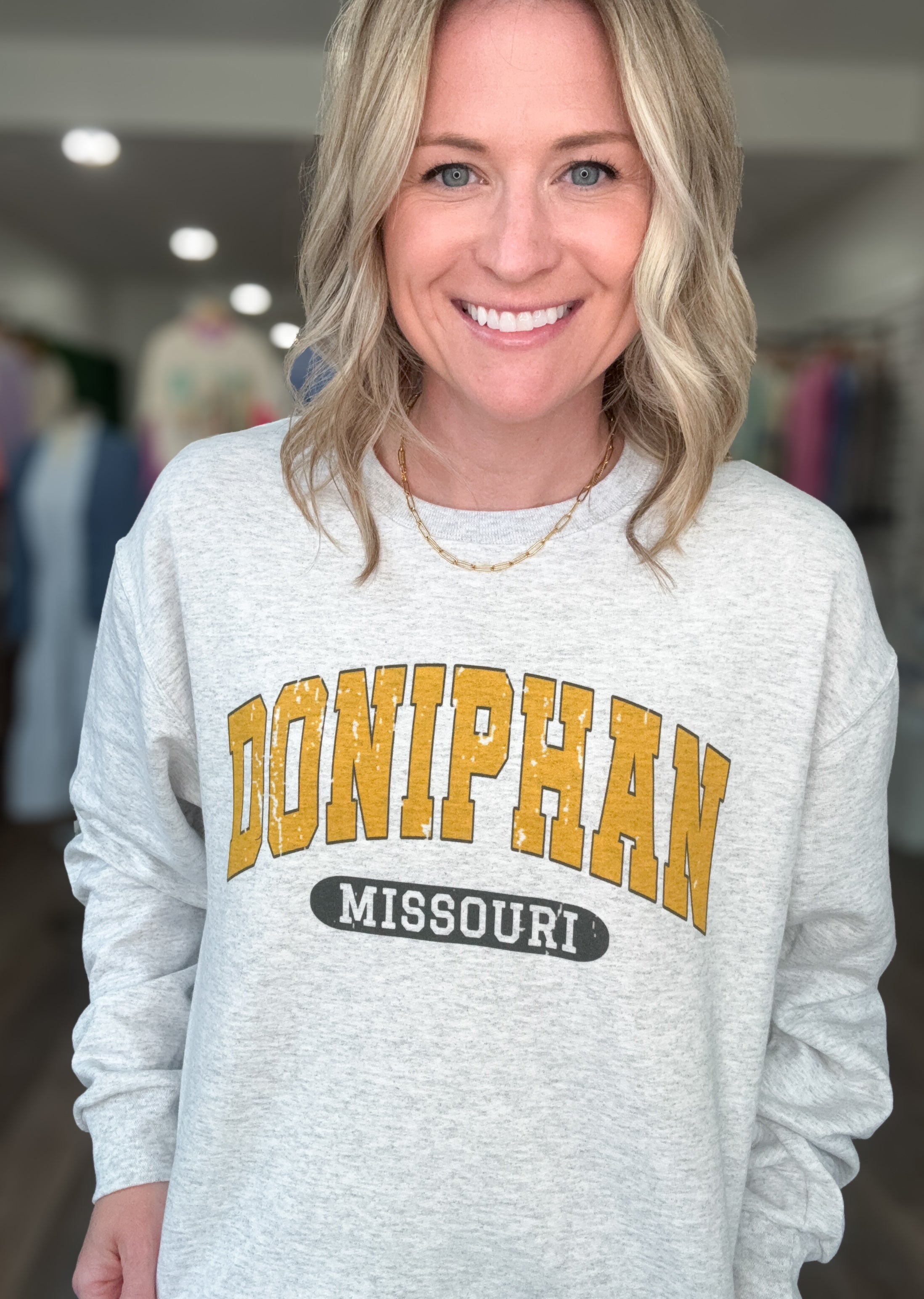 Your new go-to for cozy, everyday style—this classic crewneck keeps it simple, comfortable, and effortlessly cute while repping Doniphan.