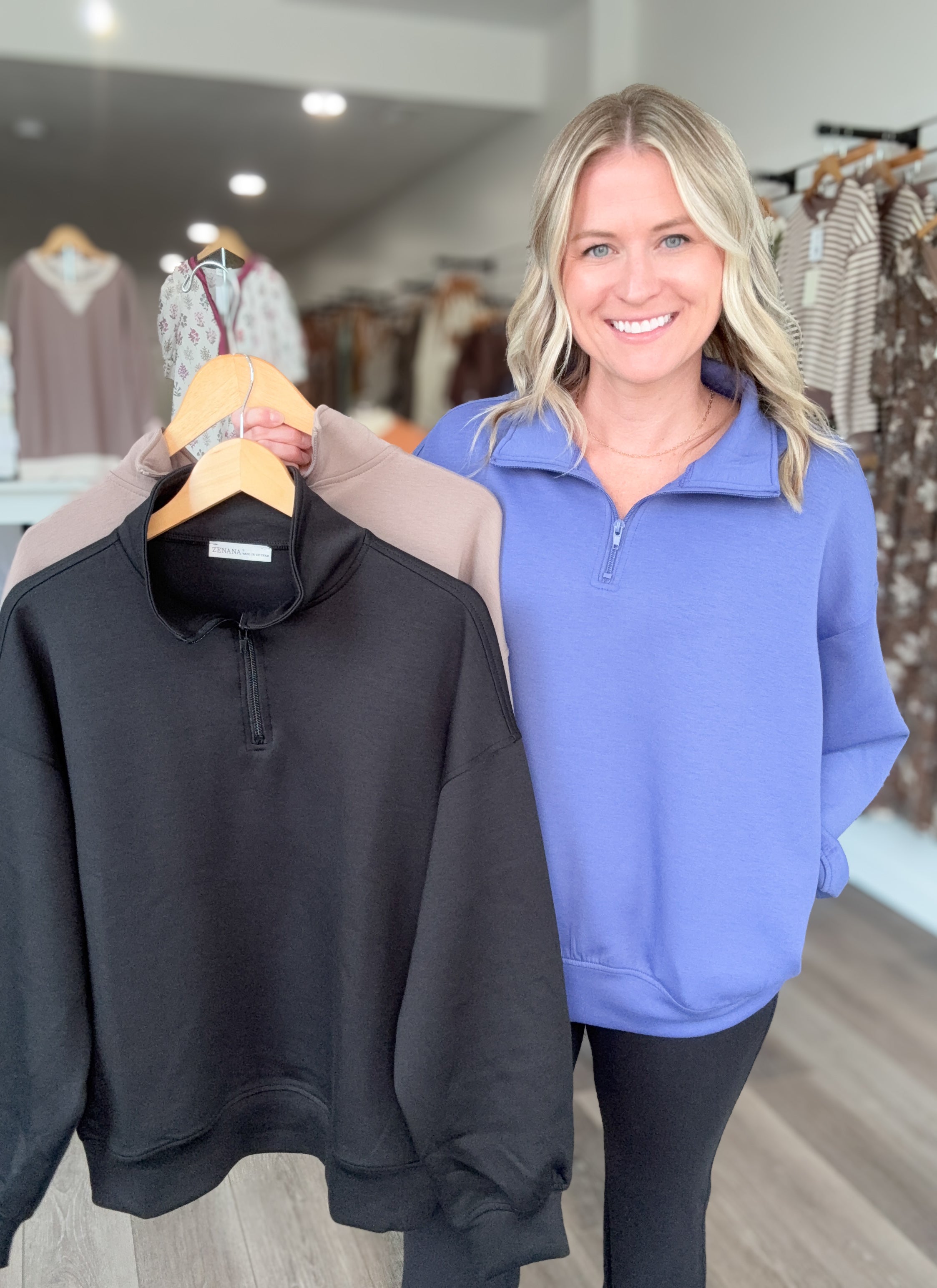A closet staple you’ll reach for again and again! Our Essential Scuba Quarter Zip Pullover is the perfect blend of comfort and everyday style. Made from ultra-soft, breathable scuba fabric, this pullover delivers effortless coziness with a relaxed fit you’ll love.