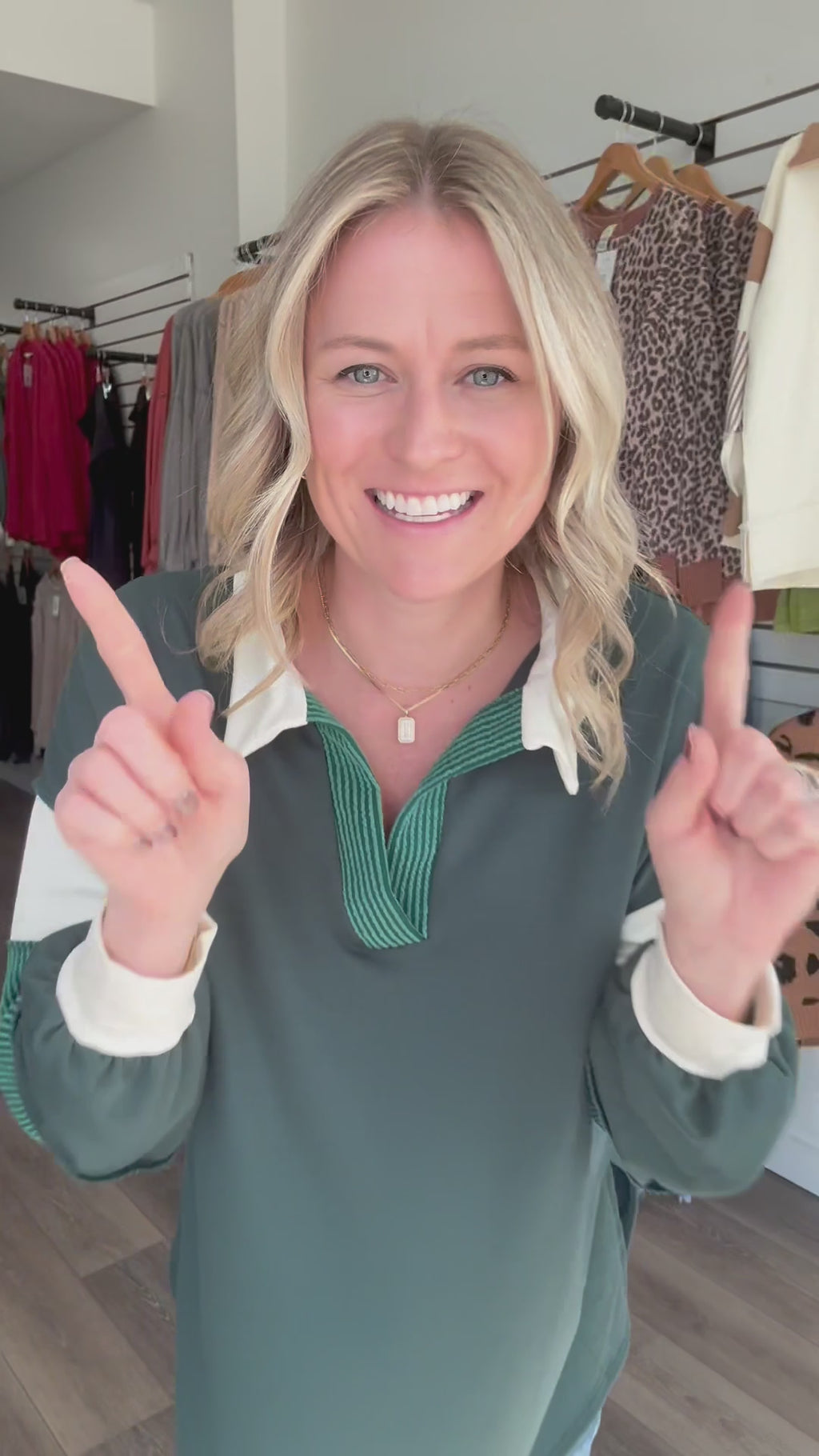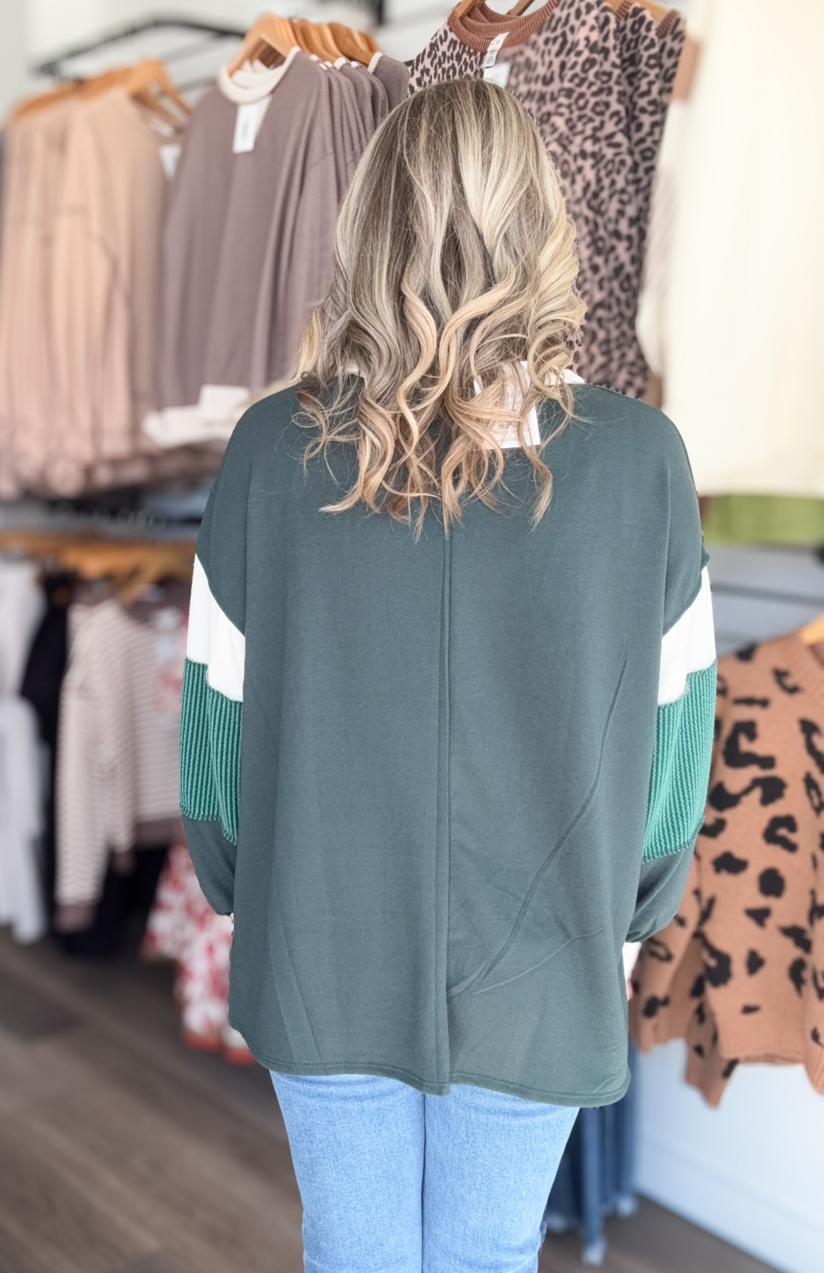 • Color block long bubble sleeves with ribbed paneling in pretty hunter green and white colors