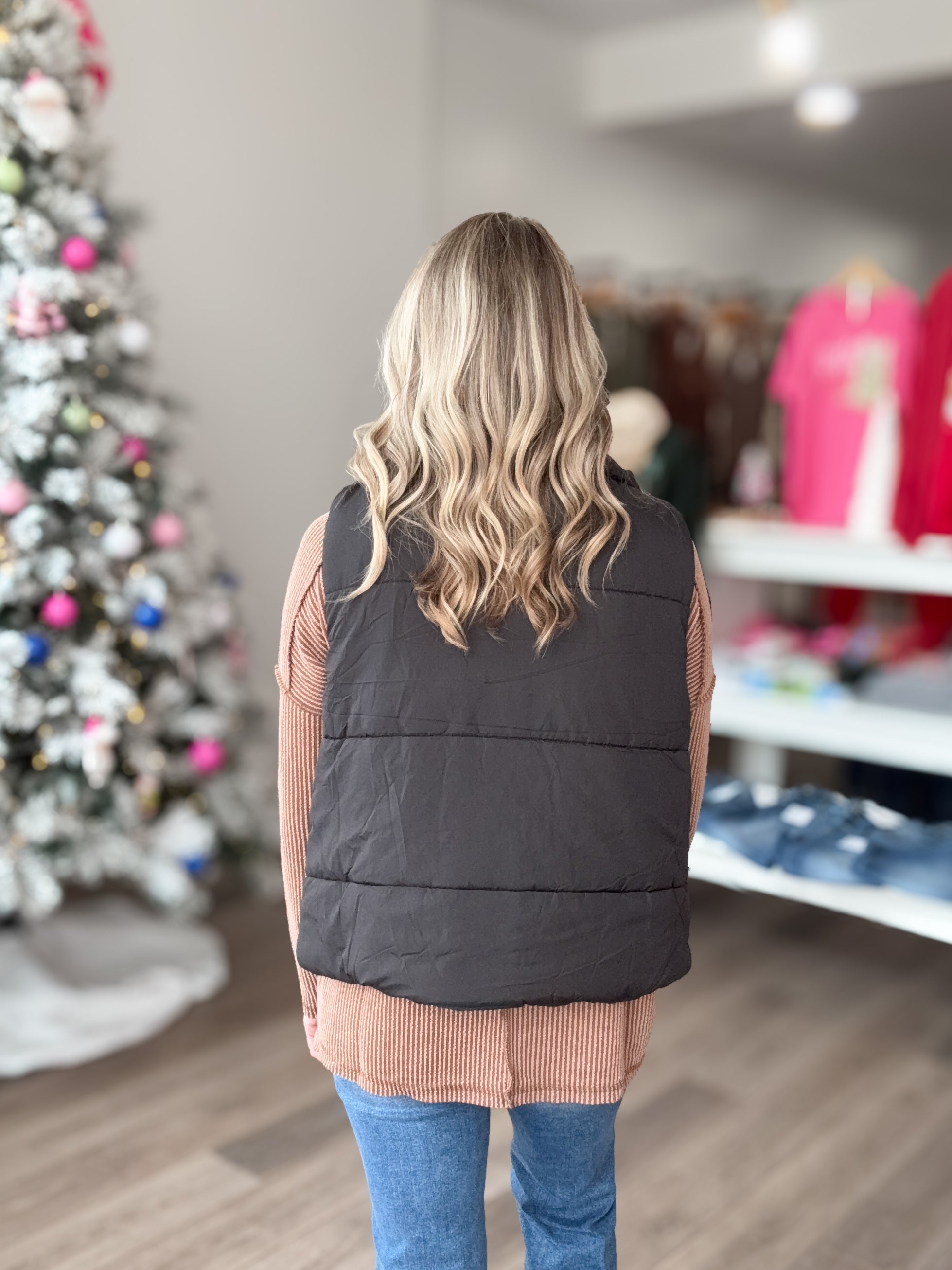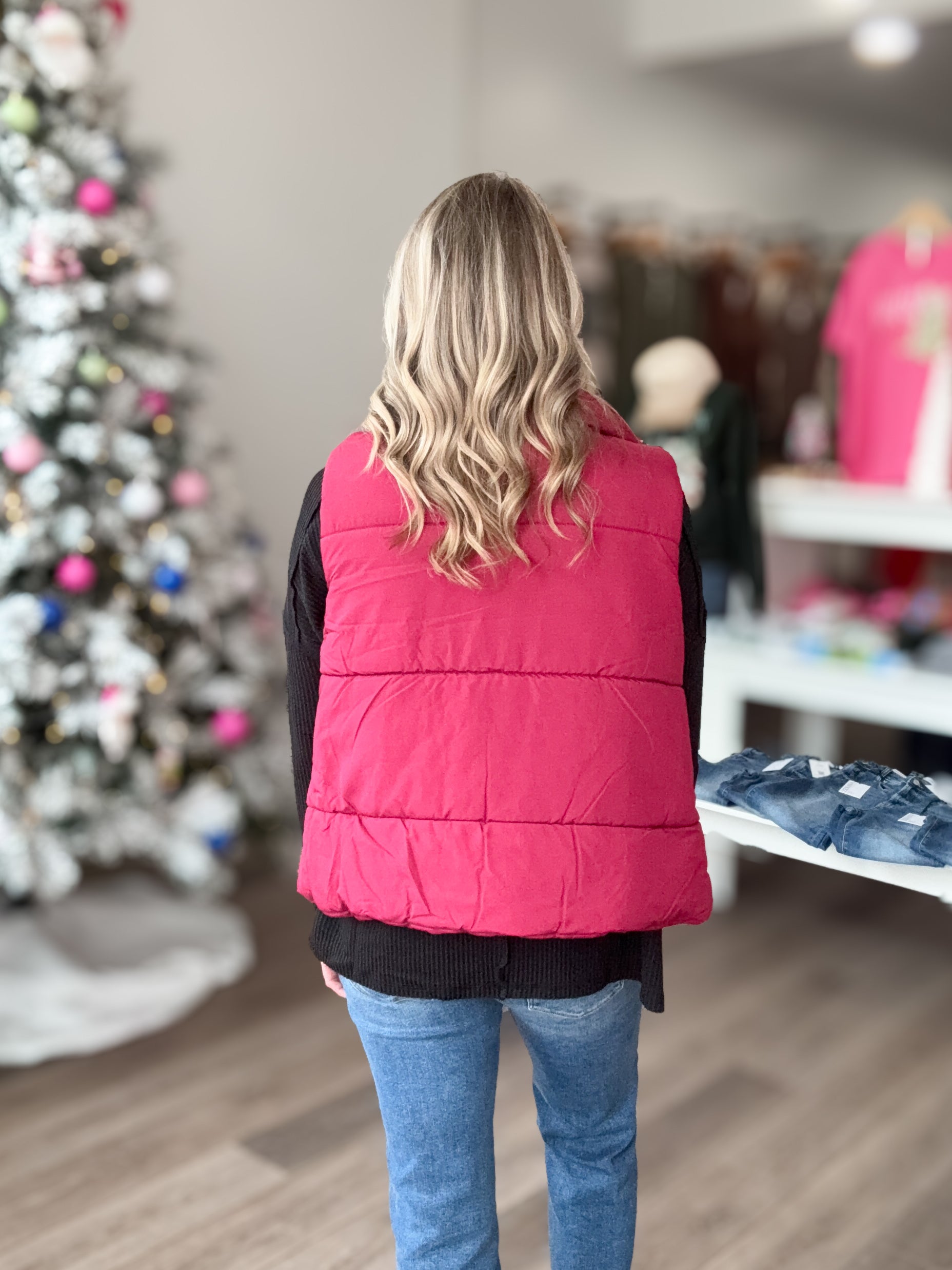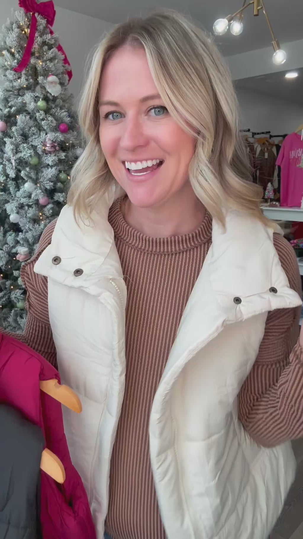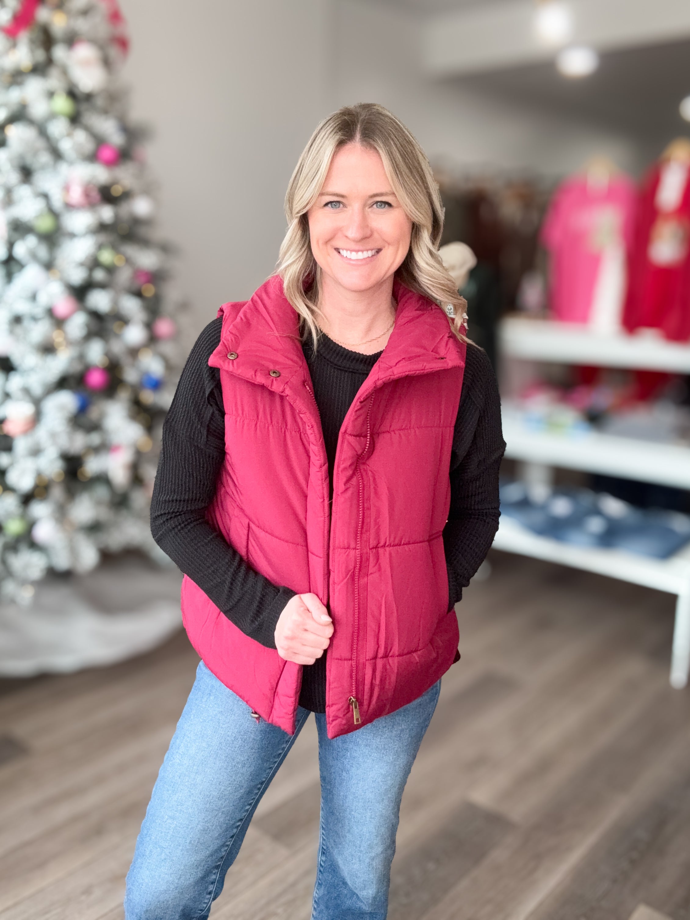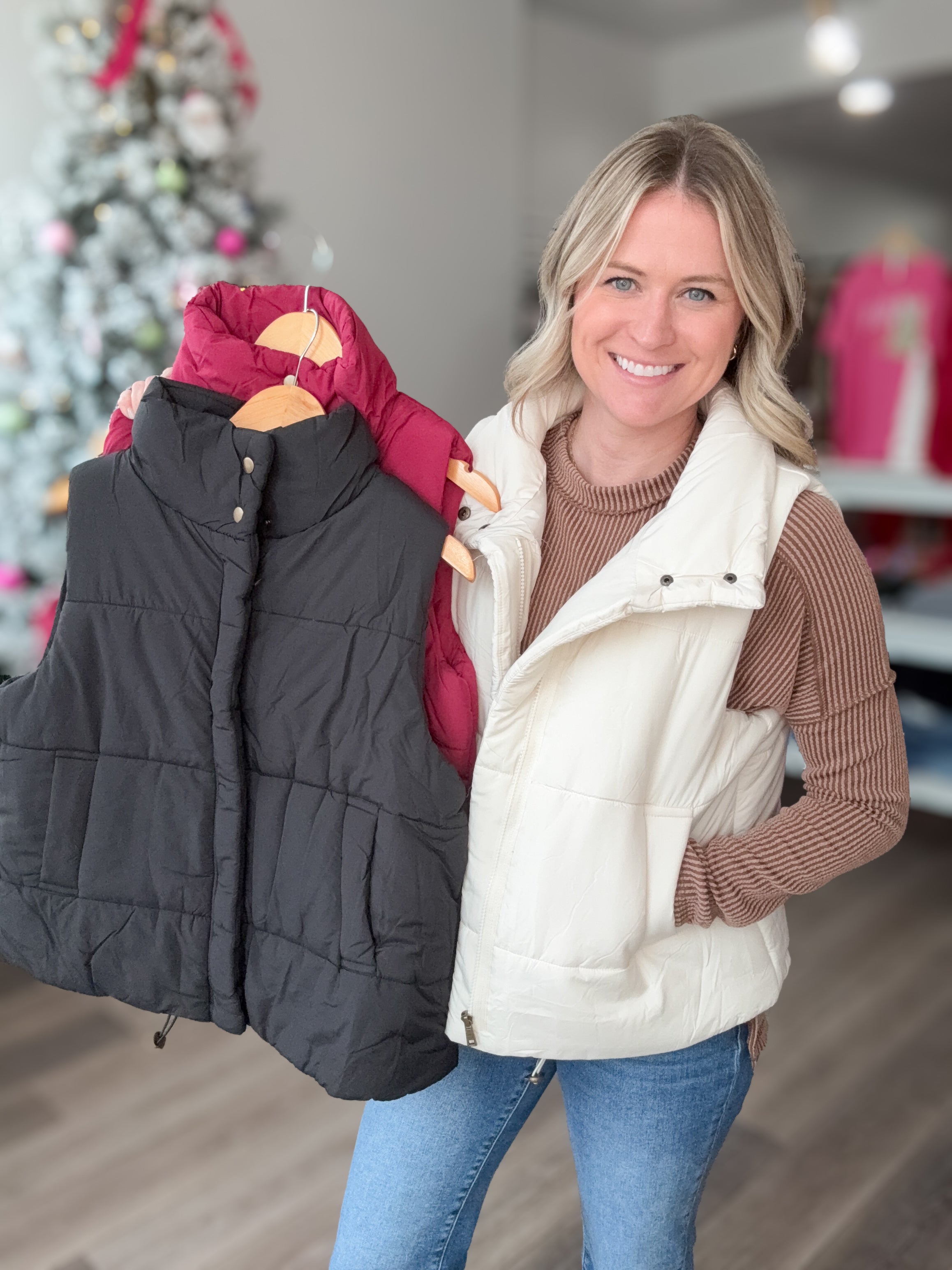 Stay cozy and stylish all season long in our Layer Up High Neck Puffer Vest — the perfect throw-on layer for cooler days. This medium-weight puffer features a functional button + zipper front, a warm high-neck collar, and an adjustable drawstring waist so you can customize your fit. Designed with side pockets and a slightly cropped silhouette that’s not too short, it gives you that effortless, relaxed look you’ll love.