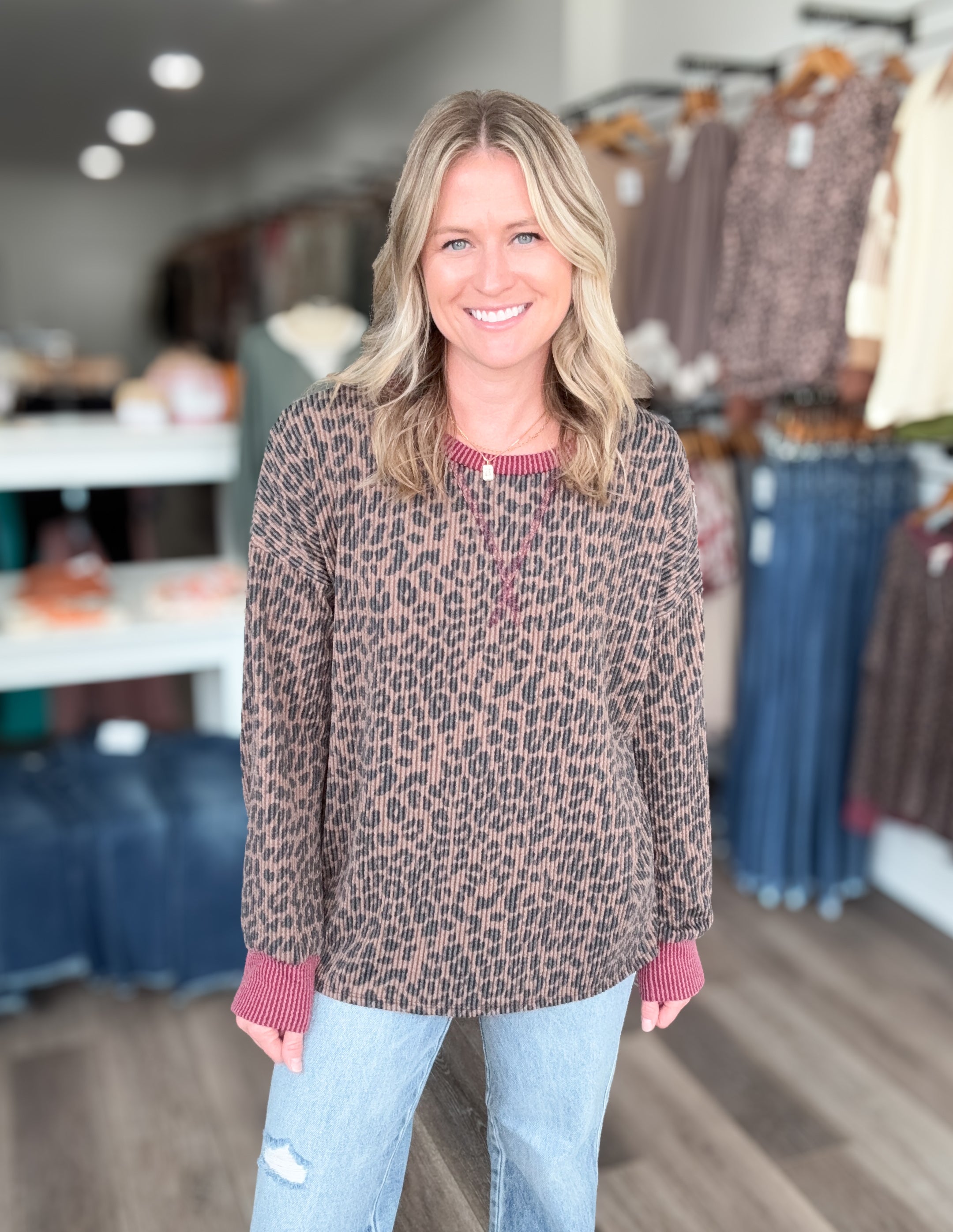 Leopard print meets cozy chic with this ribbed long-sleeved top — the perfect mix of bold and effortless. Designed with comfy details and a flattering relaxed fit, it’s a go-to piece you’ll reach for again and again.