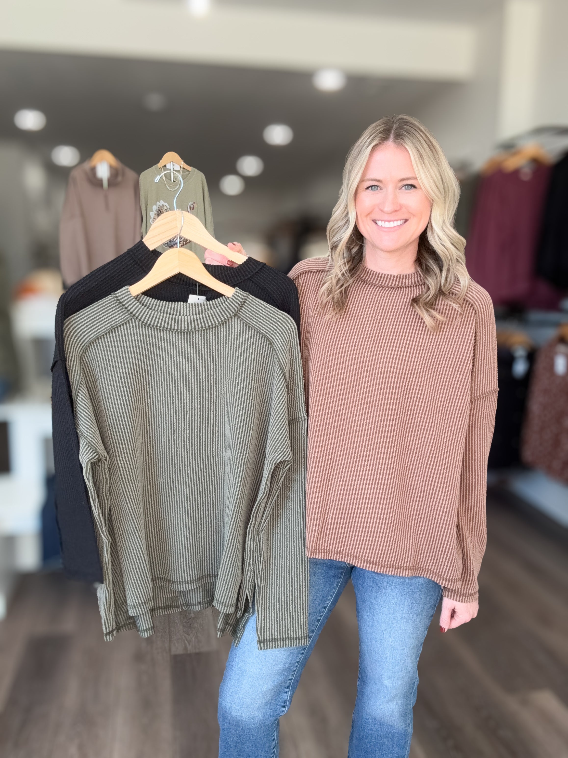 The Blake Rounded Neck Ribbed Top is the definition of effortless comfort and everyday style. Made from a soft, stretchy ribbed fabric, this top features exposed seams, side slits, and a relaxed silhouette that drapes beautifully. Its rounded boat neckline adds a touch of femininity, making it a versatile piece you’ll reach for again and again.