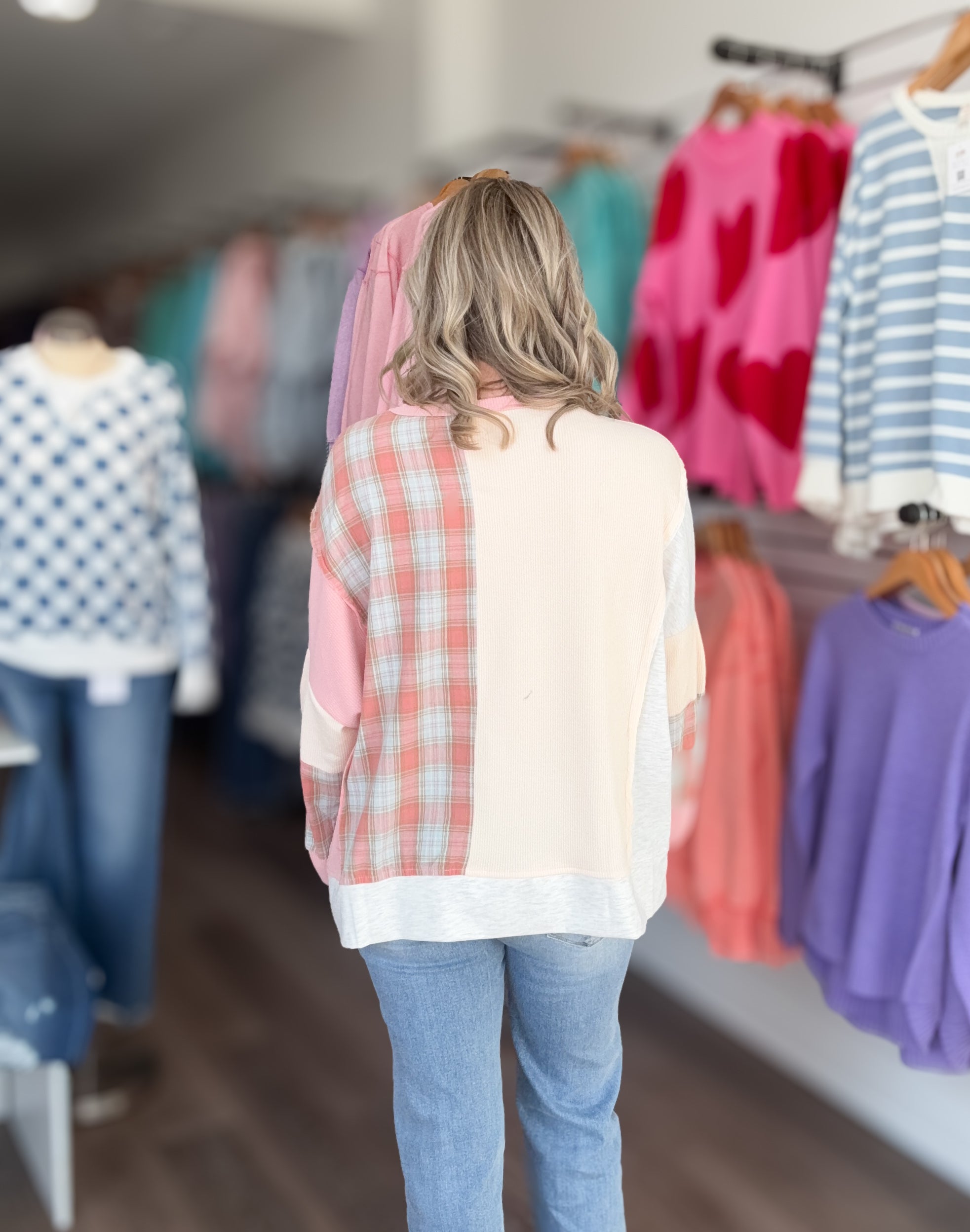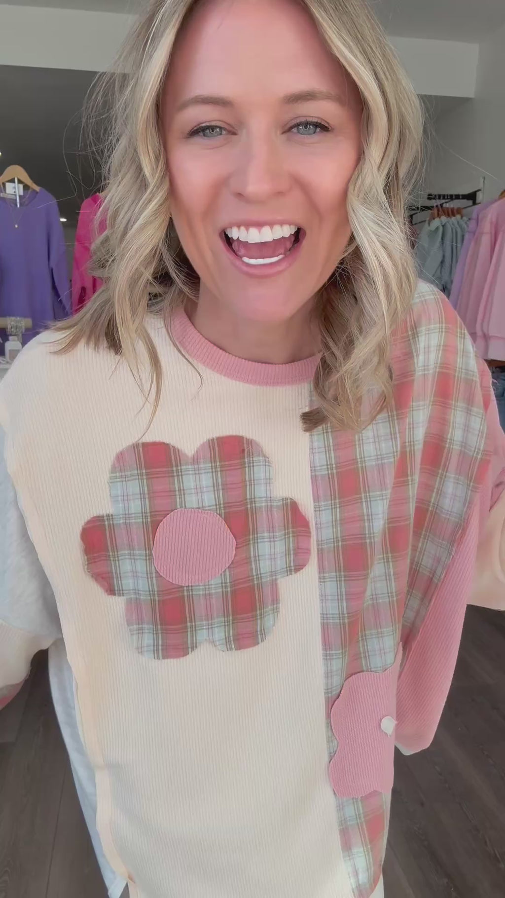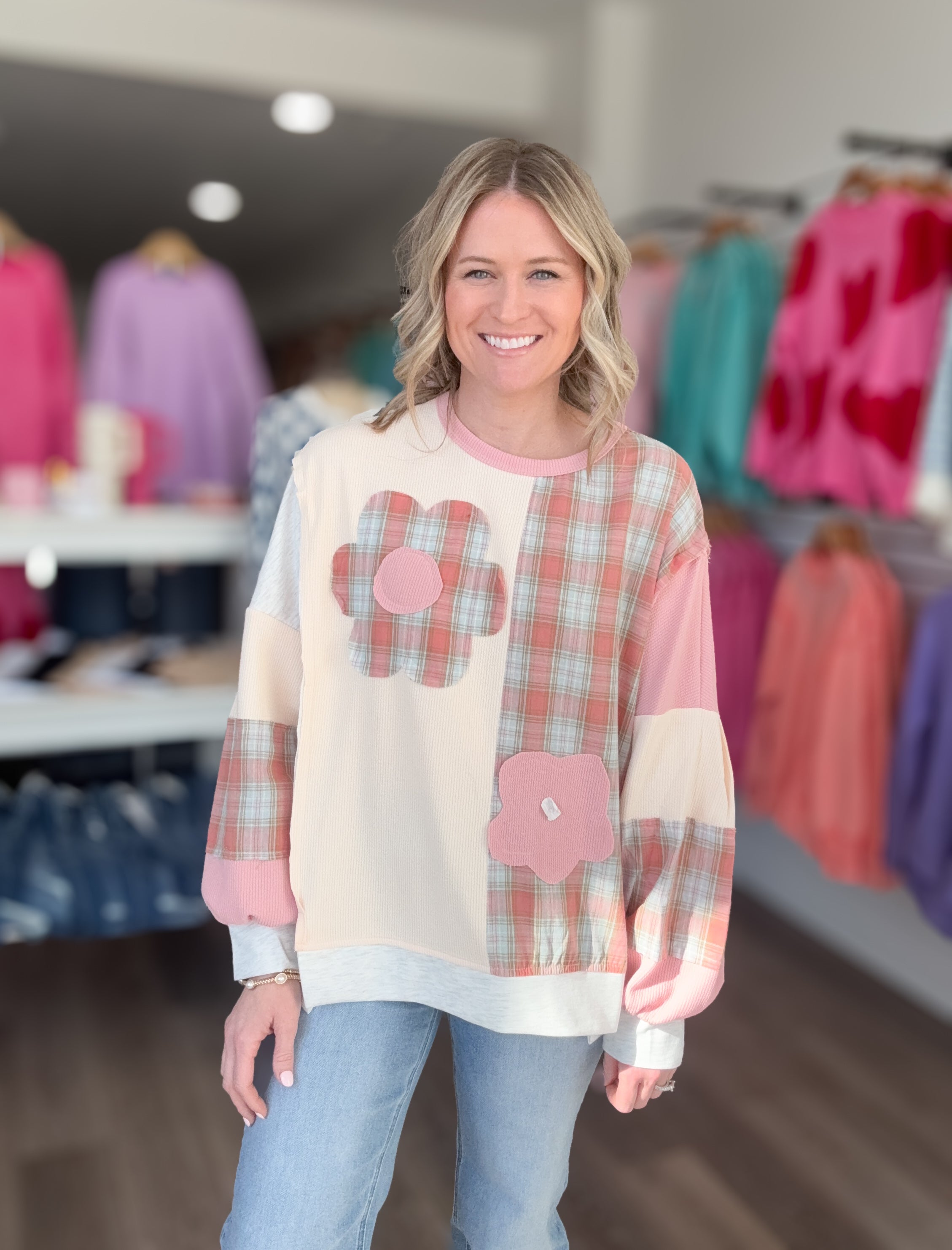 A total feel-good favorite with the sweetest mix of textures and prints. This relaxed pullover features soft color blocking with plaid accents and adorable flower patches for a playful, laid-back vibe. Easy to throw on with denim for an effortlessly cute everyday look.