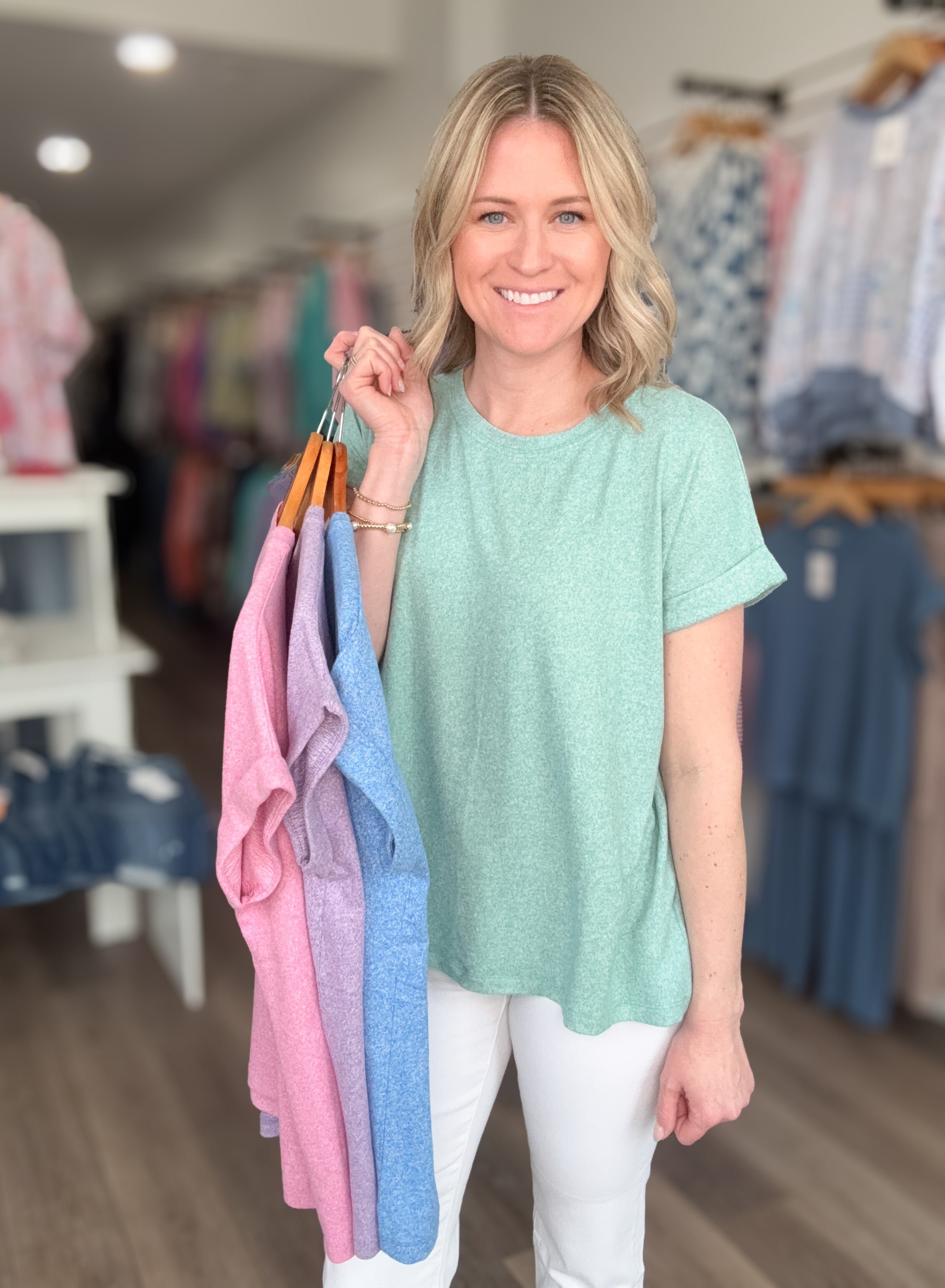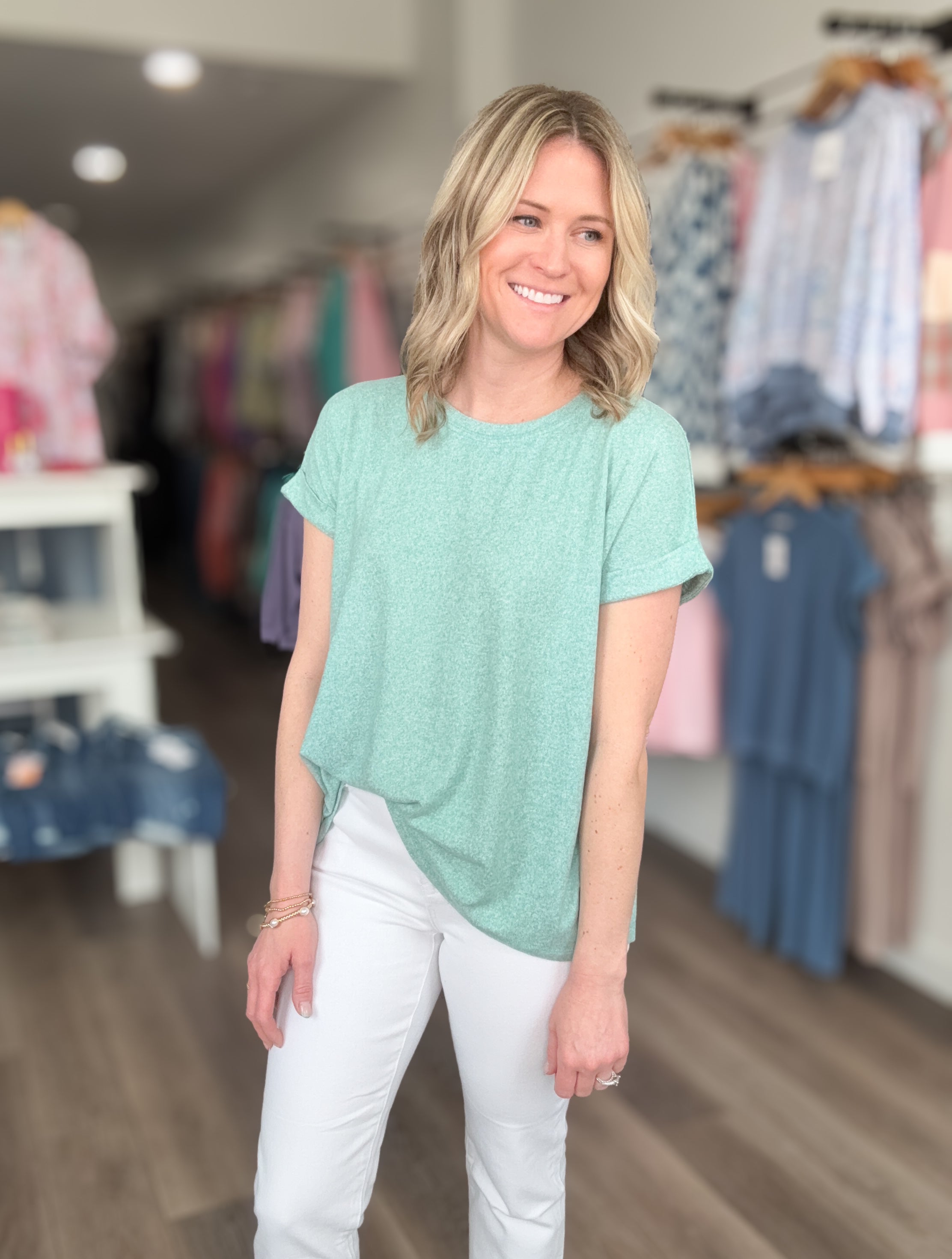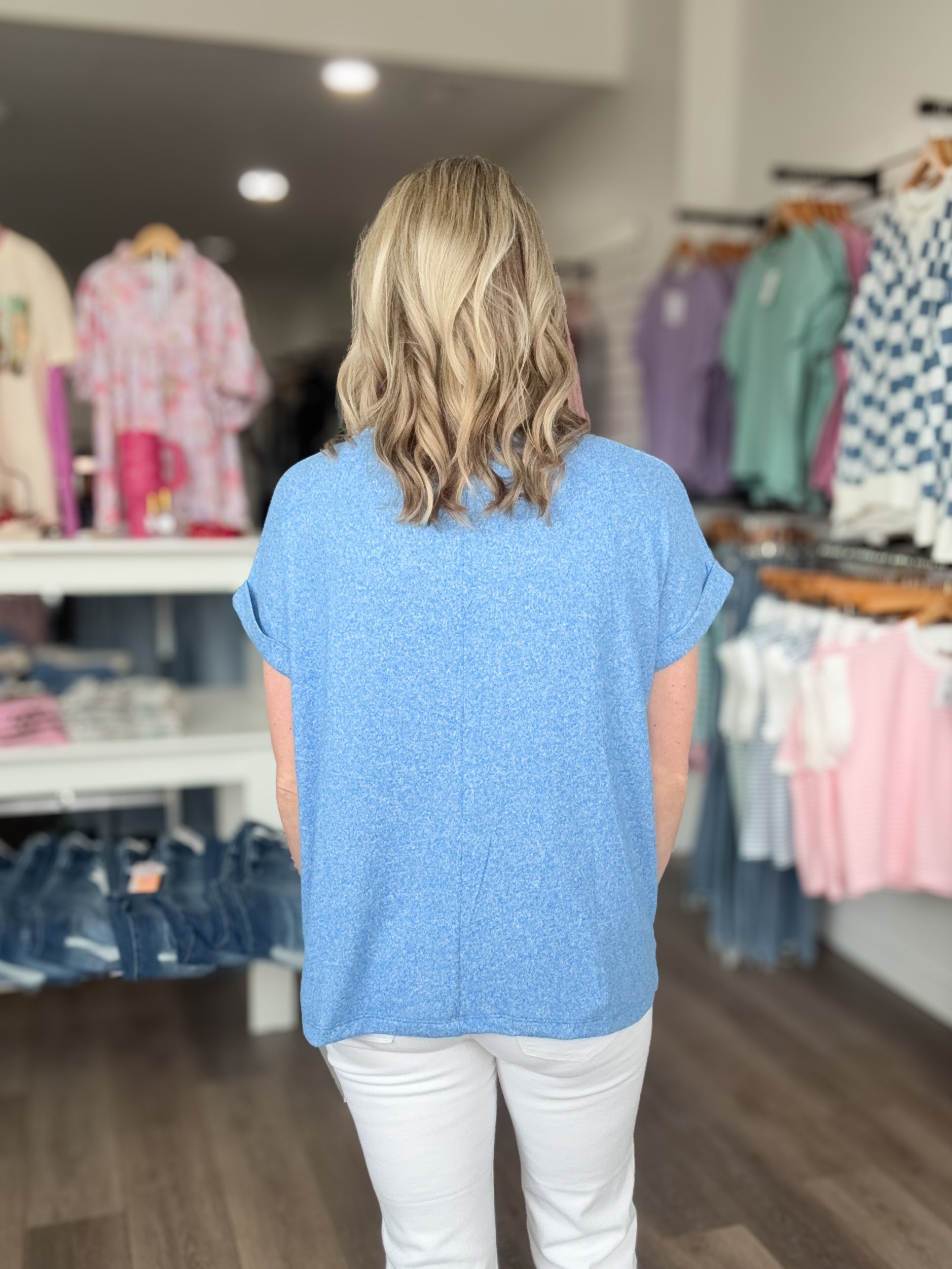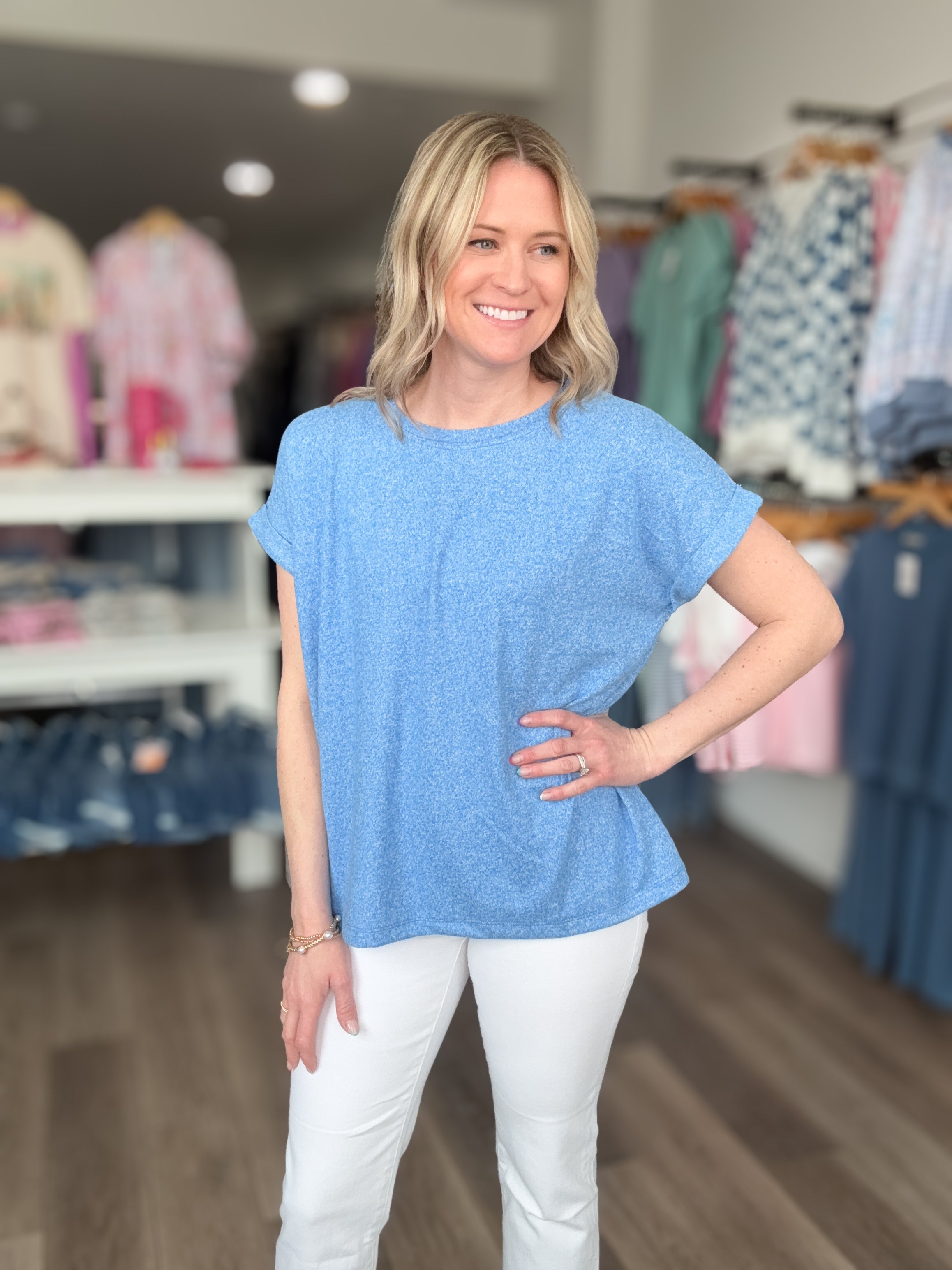 This super soft melange hacci tee is the definition of everyday comfort. Designed with a relaxed, flowy silhouette and rolled sleeves, it’s the perfect easygoing top you’ll want to wear on repeat. Lightweight, breathable, and incredibly soft, this tee pairs effortlessly with your favorite denim or shorts for a cute everyday look!